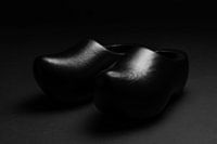Twee traditionele Nederlandse zwarte houten klompjes in low key opname