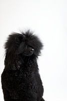 Zwarte poedel Zinzi tegen witte achtergrond
