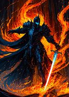 Zwarte ridder met fantasiezwaard in vlammenaura