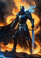 Zwarte ridder met fantasiezwaard in vlammenaura