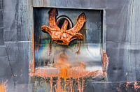 Een zwarte stalen scheepsromp met een inkassing met daarin een roestig anker. Lekstrepen, krassen, lasnaden en olievlekken met een parelmoer-effect maken het beeld compleet