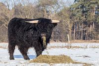 Over ‘Zwarte schotse hooglander stier eet hooi in weide met sneeuw’ van Ben Schonewille
