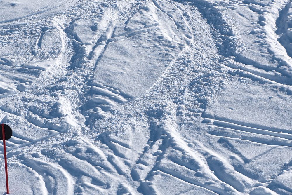 Skisporen kris kras door elkaar in de sneeuw op de zwarte piste. Een berghelling met een laag sneeuw, fel beschenen door de zon.