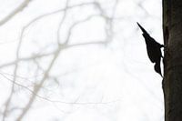 Een zwarte specht op een beukenstam waar zijn hol zich bevindt. Enkele seconden maakte hij een acrobatische pose.