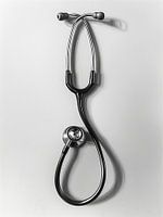 Een stethoscoop tegen een witte achtergrond in zwart en grijs met hyperrealistische details en een hoge resolutie. Effen kleurenachtergrond met een minimalistische stijl en symmetrische compositie. Zachte verlichting vanuit een hoge hoek toont de delicate textuur van de stethoscoop.
