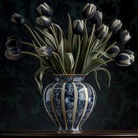 Dit beeld toont een prachtig stilleven van een boeket zwarte tulpen in een prachtige decoratieve vaas. De groene bladeren omlijsten de bloemen. De vaas is gemaakt van keramiek met een klassieke uitstraling en is versierd met blauw-witte accenten, wat een elegante contrast vormt met de tulpen. De achtergrond is donker, waardoor de kleuren van de bloemen en de vaas extra opvallen.