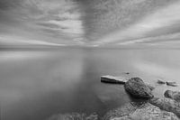 Zonsopkomst aan het Markermeer bij Edam. De stenen liggen half onder het kabbelende water. De aanwezig bewolking zorgt er voor dat er weinig kleur in de lucht zit, met als bijkomende voordeel dat de structuren in het wolkendek goed zichtbaar worden.