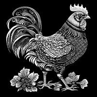 Zwartwitte haan print - Een linoleum print van een trotste haan. De haan is met witte inkt afgedruk tegen een zwarte achtergrond.