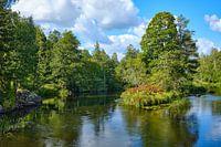 rivier in Zweden Småland, de Emån met waterplanten blauwe lucht en rotsen en waterlelie bladeren en een klein eiland in het midden