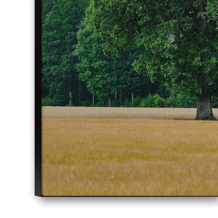 Zweeds landschap met een oude eik vol in het blad staande in een koren veld en een blauwe lucht