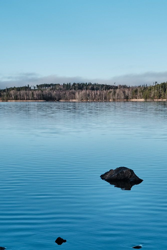 Zweeds meer in de late herfst met op de achtergrond een bomenrij en donkere wolken in de verte. Het geheel heeft een rustige en serene uitstraling