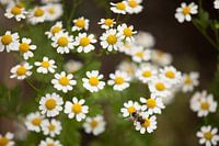 Bloemetjes van kamille met op een van de bloemen een zweefvlieg