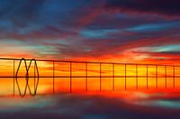 Prachtige zonsondergang bij een zwembad aan de Atlantische Oceaan in Madeira. De oranje en roze kleuren van de lucht worden weerspiegeld door het stille water.