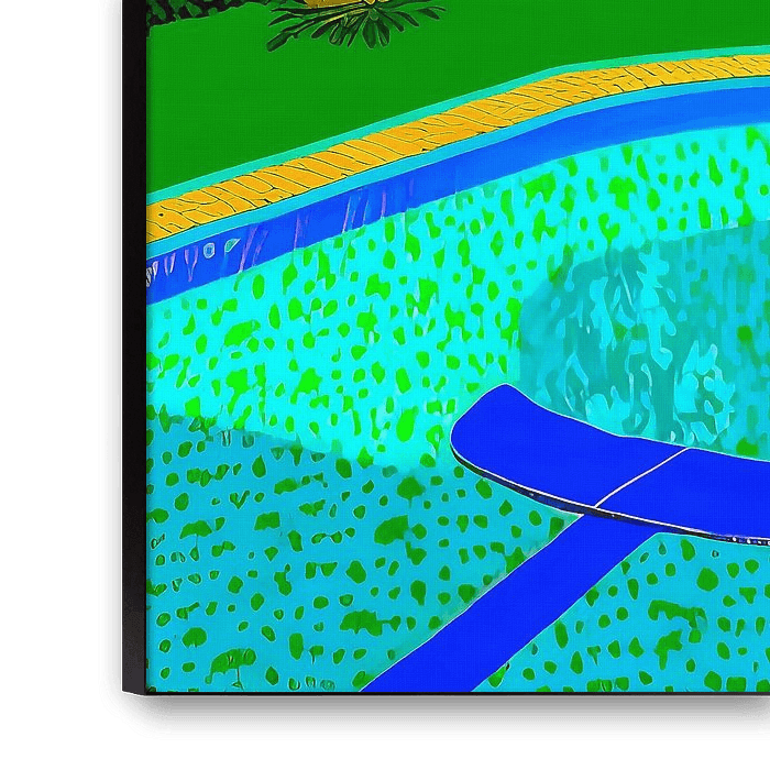 Dit schilderij toont een groene tuin op een warme zomerdag. Het middelpunt van het schilderij is een rustig en sereen zwembad omgeven door groene bomen en planten. Er zijn geen mensen te zien, dus de nadruk ligt op de rust van de omgeving. Het schilderij is vierkant van vorm en heeft een semi-abstracte stijl.