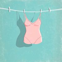 De foto toont een delicate, roze zwembroek die aan een waslijn hangt. De zachte lijnen en soepele vorm van de zwembroek steken harmonieus af tegen de lichte, kalme achtergrond. De schaduw is bijzonder opvallend, voegt diepte toe aan de foto en legt de zomerse lichtheid van het moment vast.