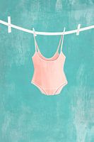 De foto toont een delicate, roze zwembroek die nonchalant aan een waslijn hangt. De zachte kleuren en de heldere, groene achtergrond brengen een vrolijke, zomerse sfeer over. De slanke snit van de zwembroek benadrukt elegantie en lichtheid, terwijl de minimalistische elementen van de afbeelding de nadruk leggen op het kledingstuk. Een zorgeloos moment vol verwachting van zonnige dagen!