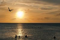 Zeemeeuwen vliegen rond boven het Arashi strand. Ze weten dat toeristen regelmatig een stukje koek of brood omhoog gooien.