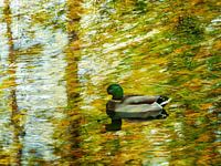 In de beek zwemt een eend. De herfst kleurt de bladeren in warm goudgeel. Het licht golvende water vangt de goudgele kleuren in zijn reflectie.