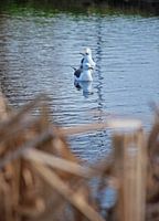 Zwemmende meeuwen, gezien vanachter riet. Zuiderpark, Den Haag