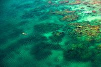 Zwemmer in de turkooisgroene zee in het Caribisch gebied met rif