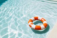 Zachte golven dansen in het zonlicht, terwijl een feloranje reddingsboei zachtjes op het glinsterende wateroppervlak drijft. De heldere, blauwe tinten van het zwembad geven een gevoel van koelte en verfrissing, terwijl de witte strepen rond de ring de vrolijke zomerstemming benadrukken. Uitnodigend en veilig tegelijk - een plek om te…