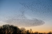 Mooie grote zwerm spreeuwen. Een zwerm spreeuwenvogels vliegt door Nederland. In januari en februari verzamelden honderdduizenden spreeuwen zich in enorme zwermen.