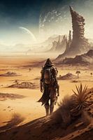 Een eenzame reiziger in een elegant, futuristisch pak staat midden in een uitgestrekte woestijn op een vreemde wereld. Torenhoge rotsformaties rijzen op in de verte, terwijl enorme planeten laag in de lucht hangen en een hemelse gloed uitstralen. Het warme, stoffige landschap contrasteert met de hightech apparatuur van het personage en roept een gevoel van eenzaamheid, ontdekking en het ontzagwekkende mysterie van onbekend terrein op. Perfect voor sciencefictionliefhebbers en liefhebbers van sfeervolle kunst met een ruimtethema.