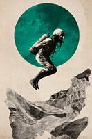 De magie van de ruimte ontvouwt zich in een surrealistische staat van suspensie: een astronaut zweeft majestueus boven steile rotsen, omlijst door een gloeiende, groenblauwe maan. De contrasten tussen het sombere landschap en het gloeiende hemellichaam creëren een sfeer van avontuur en mysterie die de kijker meeneemt naar een andere…