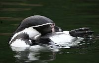 Een pinguïn drijft op zijn rug, alsof hij even de wereld loslaat. Zijn flippers omhoog, zijn blik zacht — een moment van pure rust.
