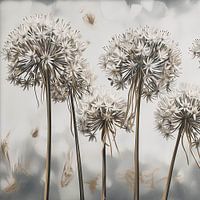 serene weergave van paardenbloemen in zaadfase, waarbij de pluizige bollen zachtjes afsteken tegen een lichte, wazige achtergrond. De stelen zijn slank en eenvoudig weergegeven, waardoor de focus volledig op de luchtige structuur van de zaadhoofden ligt. De witte en grijze tinten van de pluizen creëren een gevoel van lichtheid en beweging, alsof de zaden elk moment door een zachte bries meegenomen kunnen worden. De achtergrond, met zijn subtiele vervaging en pastelachtige tinten, versterkt het etherische en kalmerende karakter van het werk.