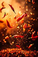 Energieke pepers dansen in een vuurzee van kleur en smaak, terwijl fijne specerijendeeltjes eromheen dwarrelen als fonkelende sterren. Deze levendige compositie roept de passie van koken en creativiteit in de keuken op. Ideaal voor de eetkamer of keukenmuur, inspireert tot culinaire hoogstandjes en brengt een levendige sfeer in huis.