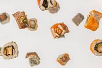 Een techniek in de foodfotografie om het eten te laten 'zweven'. Deze sushi vliegt als het ware door de lucht.