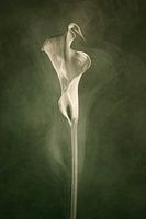 De kracht van de eenvoud. Één bloem, niet te veel kleur, waardoor de vorm het mooiste in beeld komt. Speels gewerkt met de vorm van de bloem in de achtergrond alsof er beweging in zit en ze danst...