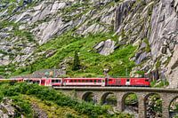 Een beeld van het Gotthardmassief vanuit Zwitserland met een trein van de "Matterhoorn gotthard bahn". In het in het kanton Ticino met de bergketen De Sint-Gotthard. De trein rijd hierover een stenen boogbrug.