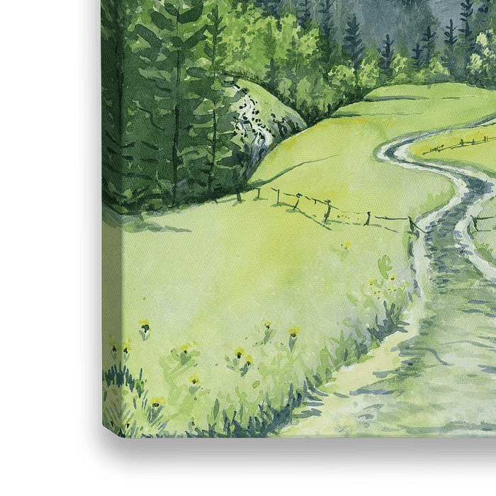 Zwitsers berglandschap, in aquarel, nabij Lauterbrunnen. Op de voorgrond een wandelpad wat het dal in loopt. Op de achtergrond een groot bergmassief met sneeuw. Ben jij een bergliefhebber? Dan is dit misschien wel iets wat goed past in jouw huis ter decoratie! Op die manier heb je de bergen altijd dichtbij!