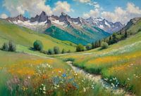 Besneeuwde bergtoppen rijzen uit boven smaragdgroene valleien bezaaid met alpenhuisjes in dit majestueuze impressionistische landschap. Kraakhelder wit en koel blauw mengen zich met fris groen en roepen de zuivere, verkwikkende lucht van de bergen op. Een perfect stuk voor liefhebbers van de grootsheid van de natuur en serene ontsnappingen.