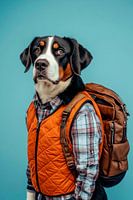 Trots en rechtop presenteert deze Grote Zwitserse Sennenhond zich in een modieus oranje vest en een gestructureerde rugzak, alsof hij klaar is voor een avontuur. Zijn trouwe blik straalt zowel intelligentie als vriendelijkheid uit, terwijl de typische zwart-witte kleur van zijn vacht een charmant contrast vormt met zijn moderne kleding.