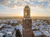 De Peperbus toren van de rooms-katholieke Onze Lieve Vrouwe ten Hemelopneming-basiliek in Zwolle steekt uit boven de besneeuwde daken in de binnenstad. De kerktoren, die Peperbus (peperbus) wordt genoemd, is een van de hoogste en beroemdste kerktorens van Nederland.