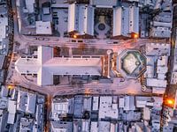 De Peperbus toren van de rooms-katholieke Onze Lieve Vrouwe ten Hemelopneming-basiliek in Zwolle steekt uit boven de besneeuwde daken in de binnenstad. De kerktoren, die Peperbus (peperbus) wordt genoemd, is een van de hoogste en beroemdste kerktorens van Nederland.