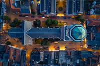 Luchtfoto van de binnenstad van Zwolle tijdens een zomerse zonsondergang. Van bovenaf gezien zien we verschillende historische gebouwen.