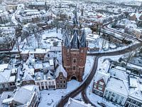 Zwolle Sassenpoort tijdens een koude winterochtend met sneeuw op de daken in de binnenstad van bovenaf gezien. De Sassenpoort werd gebouwd in de 14e eeuw, om precies te zijn tussen 1406 en 1409, en diende als een van de hoofdingangen van de vestingstad Zwolle. De poort werd gebouwd als onderdeel van de verdedigingsmuren van de stad en werd voornamelijk gebruikt om de toegang tot de stad te controleren en om de inwoners te beschermen tegen mogelijke bedreigingen. De naam van de poort, "Sassenpoort", betekent "Saksische Poort" in het Engels, wat verwijst naar de kooplieden uit de Saksische regio die door deze ingang de stad binnenkwamen. De Sassenpoort was strategisch gelegen op een cruciale locatie langs de verdedigingsmuren van de stad en verbond het centrum van de stad met de regio in het oosten. Het heeft een rechthoekige vorm met een hoogte van ongeveer 38 meter (124 voet) en een breedte van ongeveer 20 meter (66 voet). De poort is versierd met decoratieve elementen, waaronder torenspitsen, kantelen en torentjes, die haar een opvallende en imposante uitstraling geven.