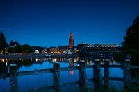 Zicht op Zwolle, de hoofdstad van Overijssel, in de avond met centraal in de afbeelding de Peperbus. De foto is genomen bij het Zwarte Water en de stad reflecteert in het water.