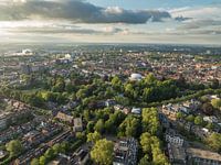 Luchtfoto van de binnenstad van Zwolle tijdens een vroege lentedag. Van bovenaf gezien zien we verschillende historische gebouwen, zoals de Peperbus kerktoren, Sassenpoort en Fundatie museum met het moderne design op het dak.