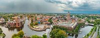 Zwolse binnenstad met stormwolken in de verte tijdens een zomerse zonsondergang aan het einde van een warme en vochtige zomermiddag. Panoramafoto bij het Zwarte Water en Rode Torenplein met rechts de Peperbus kerktoren.