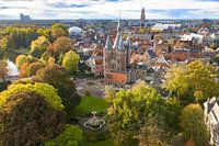 Luchtfoto van de binnenstad van Zwolle bij de Sassenpoort tijdens een mooie herfstdag.