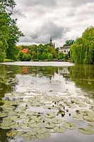 Aankomend onweer boven de stadsgracht in Zwolle in de zomer met de Sassenpoort op de achtergrond. Waterleliebloemen bloeien in de gracht op de voorgrond.