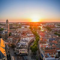 Luchtfoto van de binnenstad van Zwolle tijdens een vroege lentedag. Van bovenaf gezien zien we verschillende historische gebouwen, zoals de Peperbus kerktoren, Sassenpoort en Fundatie museum met het moderne design op het dak.