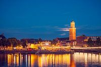 Zomeravond in de binnenstad van Zwolle aan het Zwarte Water met de Peperbustoren op de achtergrond. Mensen op het Rode Torenplein genieten van de warmte van de kalme zomeravond met de lichten van de stad gereflecteerd op het oppervlak van het Zwarte Water en de stadsgracht.