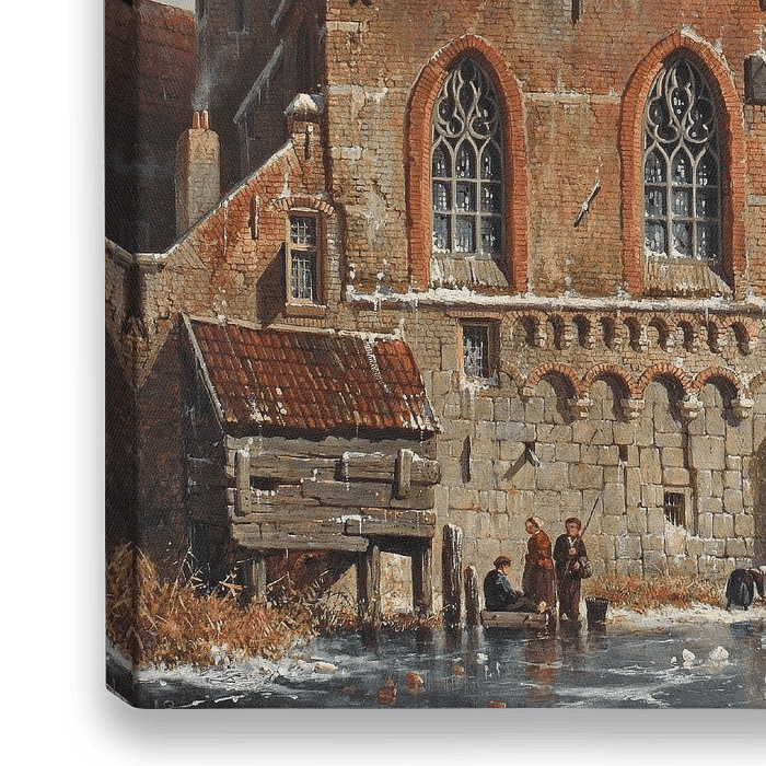 Gezicht op het Oude Gasthuis te Zwolle: skaters on a frozen waterway with a capriccio view of the Binnen-Gasthuis, Zwolle
