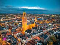 Zwolse binnenstad tijdens zonsondergang van bovenaf gezien tijdens een wintermiddag bij de Peperbus klokkentoren van de Basiliek Onze Lieve Vrouw Tenhemelopname.